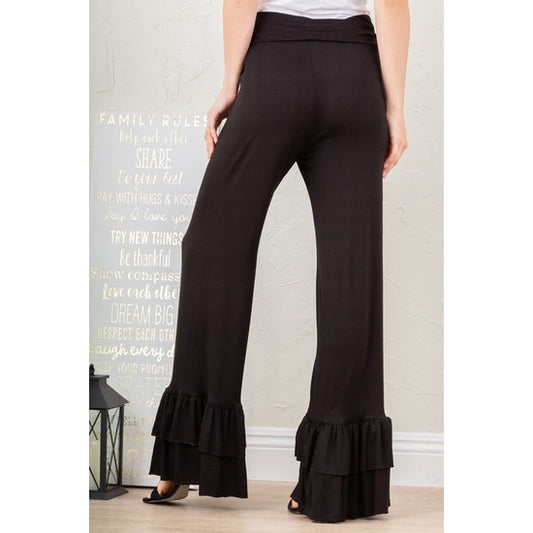 FOLD OVER WIDE LEG SOLID RUFFLED PANTS-BLACK